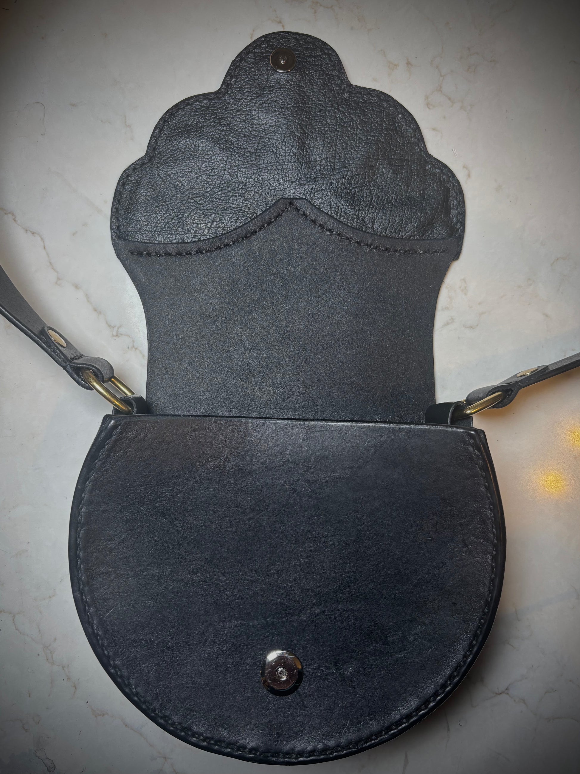 Hand Carved, Tooled, Stained, Painted and Stitched Handbag with magnetic snap closure and adjustable cross body strap with solid brass hardware and buckle. Has one internal pocket that fits a cards and other small items!