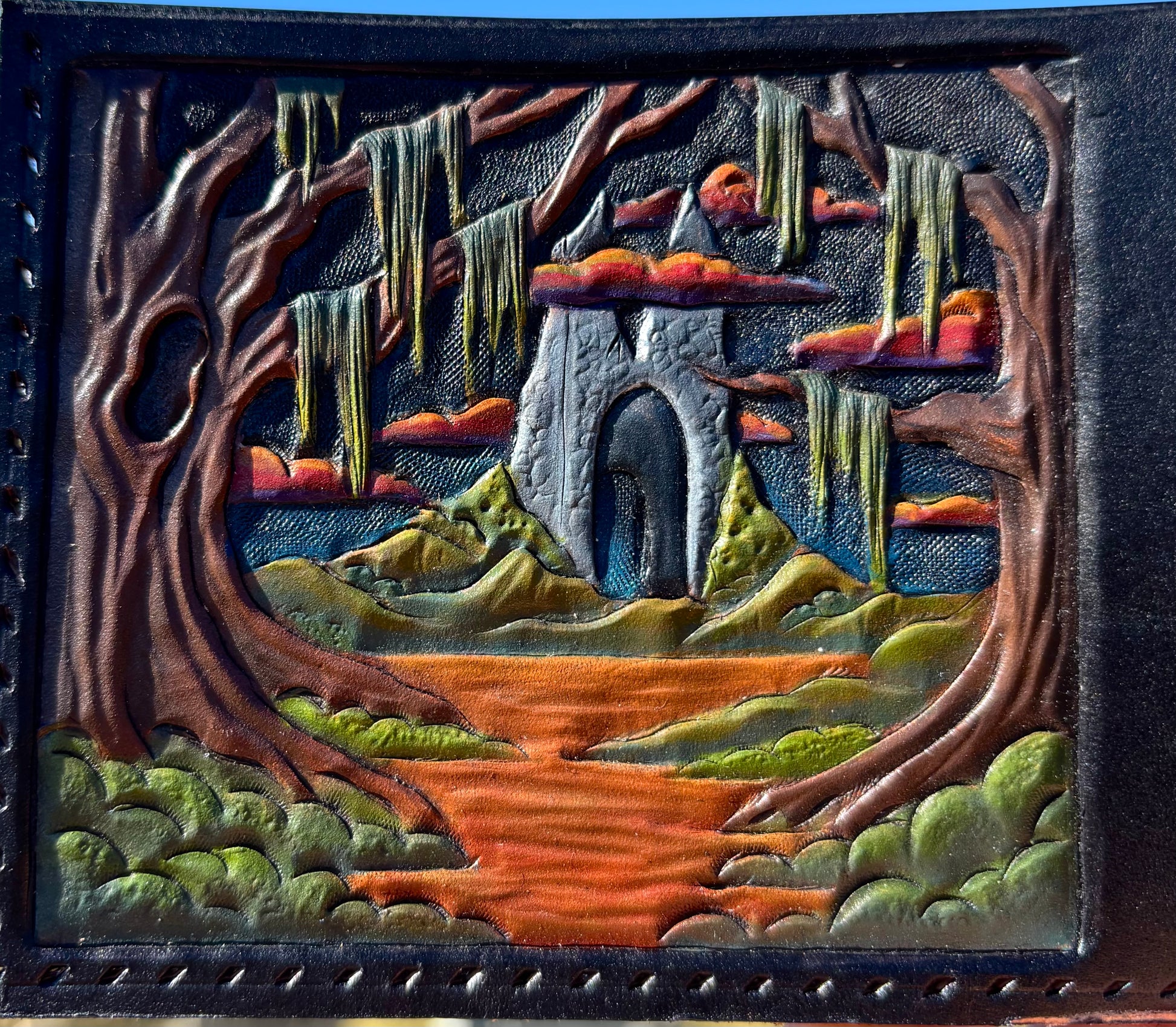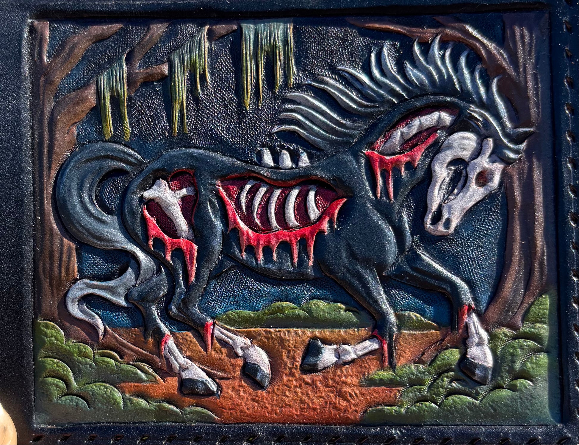 Hand Carved, Tooled, Stained, Painted and Stitched Bifold Wallet. Four card pockets that can hold multiple cards, and one large pocket for cash.